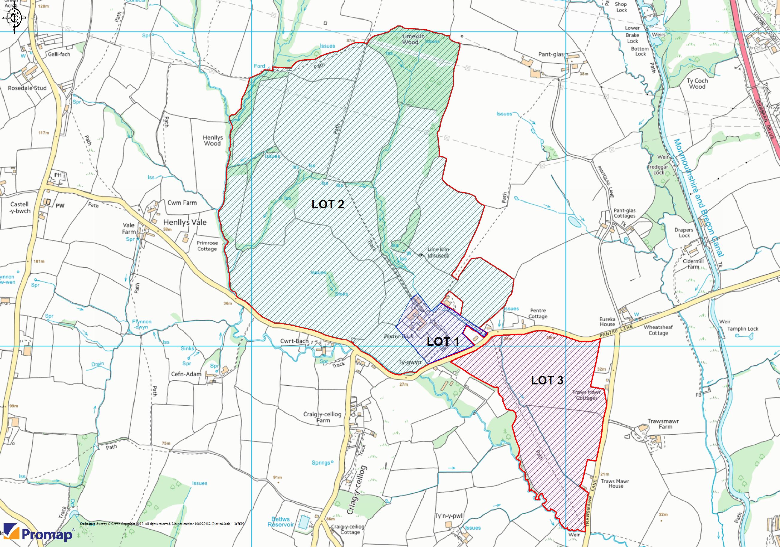 A further block of grassland lies directly south of Pentre Lane. In all 215 acres available as a whole or in three lots.